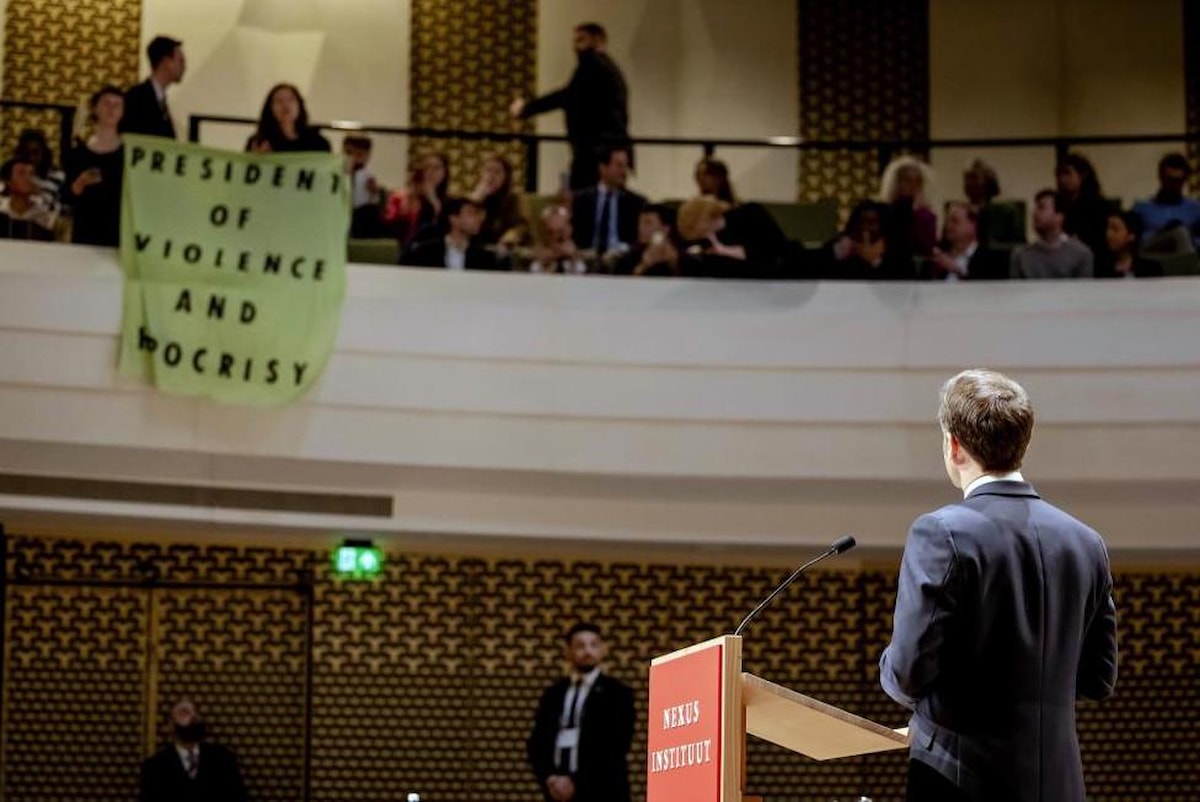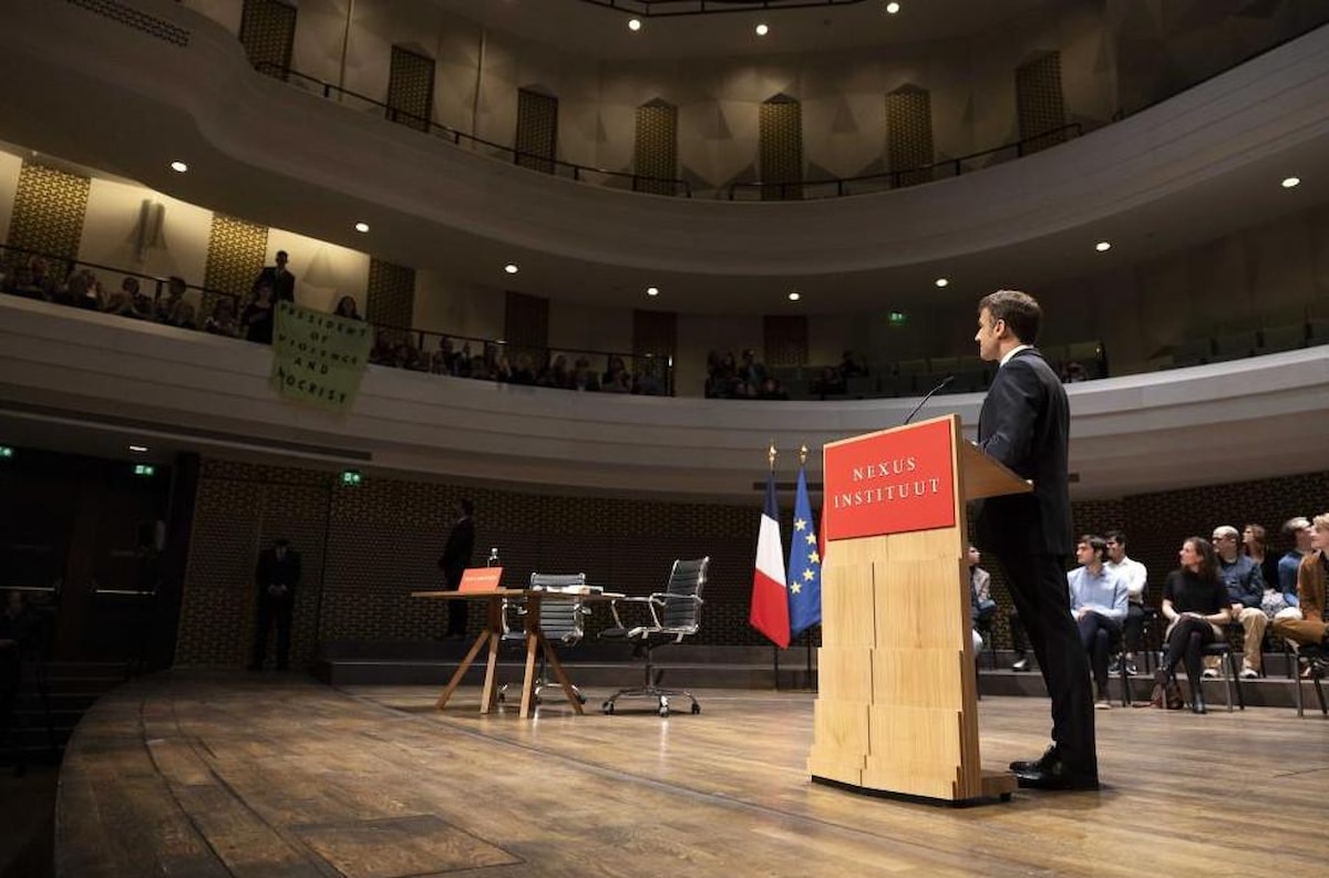 Lahey'deki Amare Tiyatrosu’nda Nexus Enstitüsü tarafından düzenlenen etkinliğin açılış konuşmasını yapan Macron’un sözleri göstericiler tarafından kesildi.