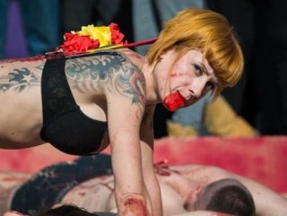 "Boğalar acı çekiyor!" sloganı atan grup, meydanın bir bölümünü arenaya çevirip vücutlarını kan rengine boyayarak, iç çamaşırlarıyla yere uzandılar.