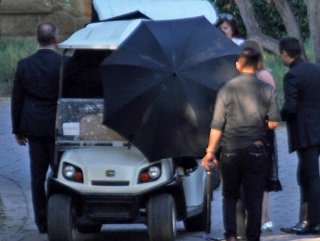 Basına kapalı olarak gerçekleştirilen düğünde, paparazilerin görüntü almamaları için büyük çaba sarf edildi. Tören alanına gelirken ünlü çiftin aracı büyük şemsiyelerle kapatıldı.