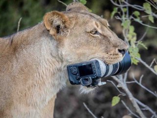 Şaşkın fotoğrafçı, makinesinin aslanlara oyuncak olduğu anları başka bir fotoğraf makinesiyle kaydetti.