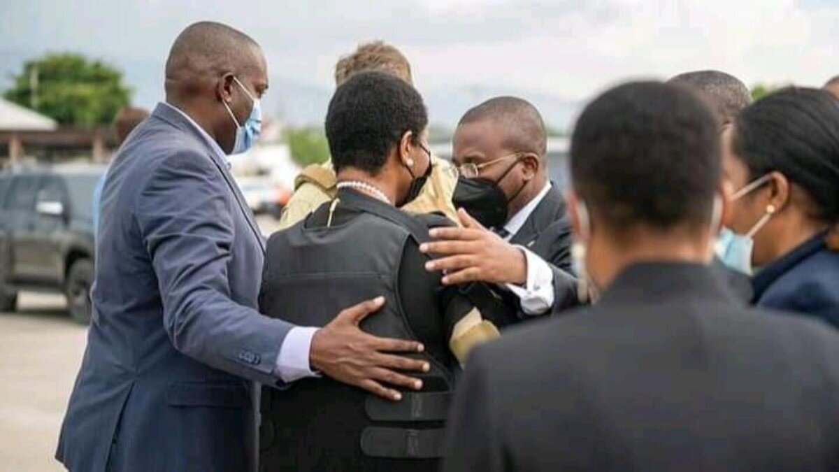 Güvenlik görevlileri tarafından olası bir saldırıya karşı sıkı korunduğu görülen Martine Moise'yi havaalanında geçici Başbakan Claude Joseph ve diğer yetkililer karşıladı.