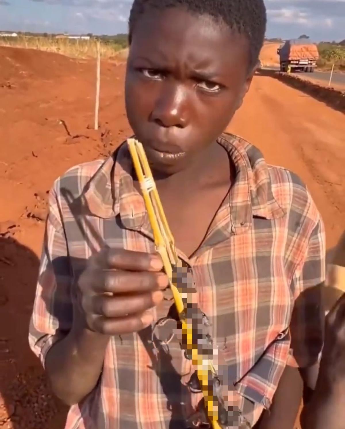 Afrika'da bir bölgede çekilen görüntülerde bir çocuk, sopaya sıkıştırılmış ölü fareleri çerez gibi yiyor.