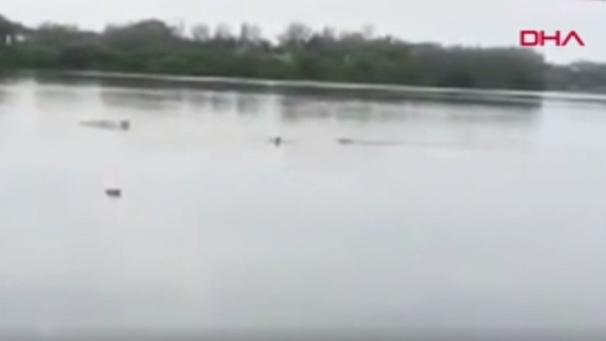 Sosyal medyada paylaşılan görüntülerde, gölde yüzen kişiye bir timsahın yaklaştığı ve adamın aniden gözden kaybolduğu görüldü.