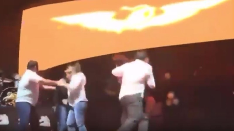 Dev metal ekranın düşmesinin ardından sahnenin çatısının da çöktüğü ve orada bekleyenlerin "büyük" panik yaşadığı kameralara yansıdı.