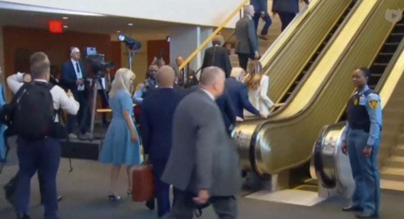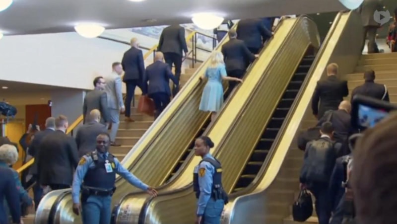 İlk olarak önde olan Melania ardından da Donald Trump, hareketsiz olan yürüyen merdivenden yukarı çıktı.