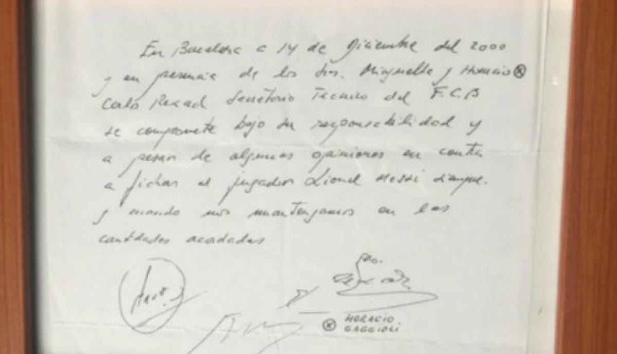 Barselona'da, 14 Aralık 2000 tarihinde ve Messrs Minguella ve Horacio'nun huzurunda, FC Barcelona'nın sportif direktörü Carles Rexach, kendi sorumluluğu altında ve herhangi bir karşı görüşe bakılmaksızın, işbu belgeyle şunu kabul eder: Üzerinde anlaşılan miktarlara uymamız şartıyla, Lionel Messi ile sözleşme imzalayacağız.