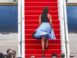 Uçağın merdivenlerinde el sallayarak veda ettiği sırada esen sert rüzgar First Lady Obama'ya zor anlar yaşattı.