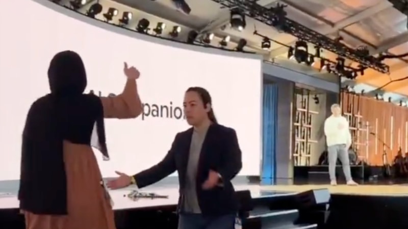 Seyircilerin arasından sahneye yaklaşan Microsoft çalışanı Ibtihal Aboussad, Süleyman’a dönerek şunları söyledi: