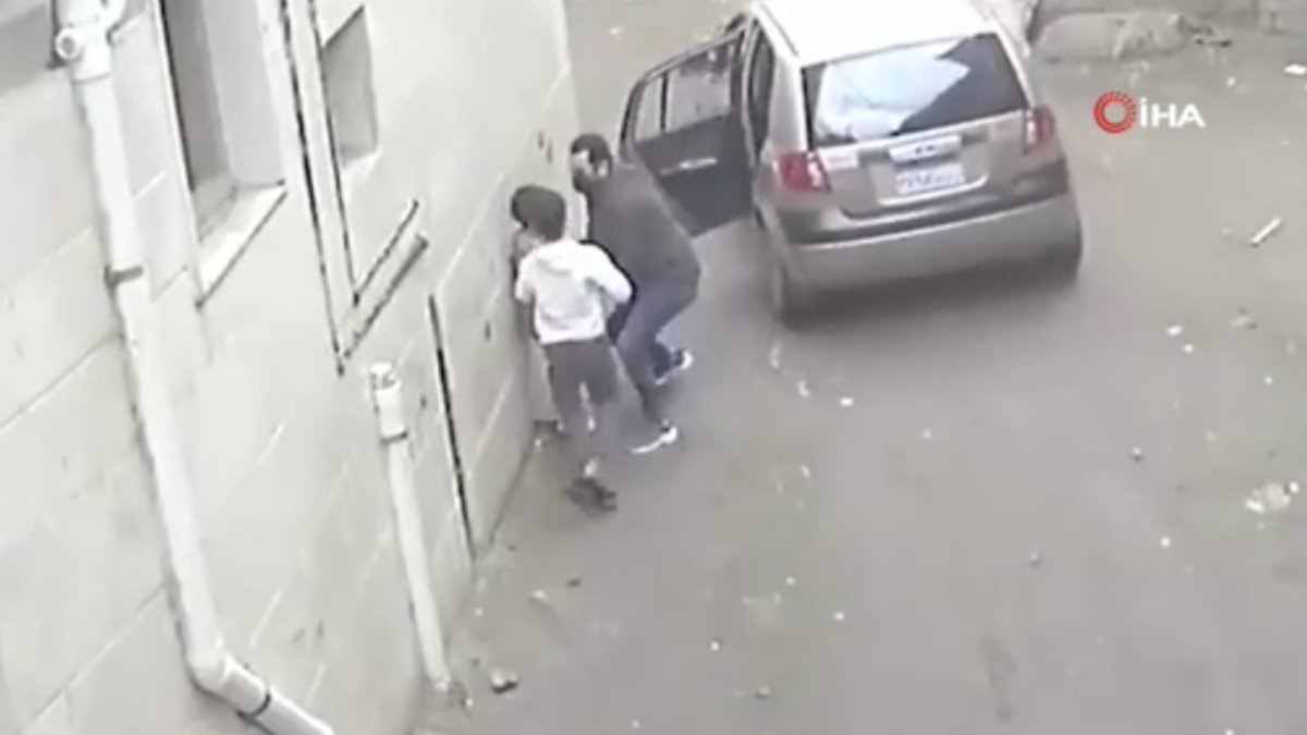 Güvenlik kamerasına yansıyan görüntülerde, arkadaşıyla birlikte çocuğunun yanına gelen baba, araçtan inerek çocuğunu kaçırmak istedi.