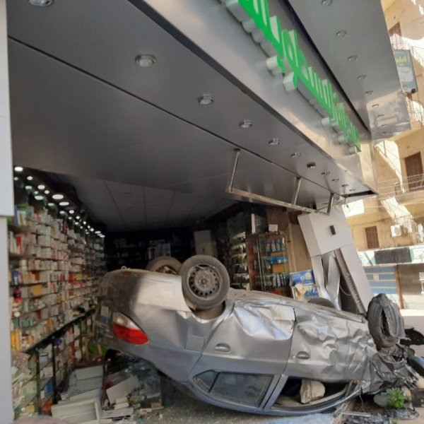 Mısır'ın Mansura kentinde sürücüsünün kontrolünden çıkan otomobil Cumhuriyet Caddesi'nde bulunan bir eczaneye girdi.