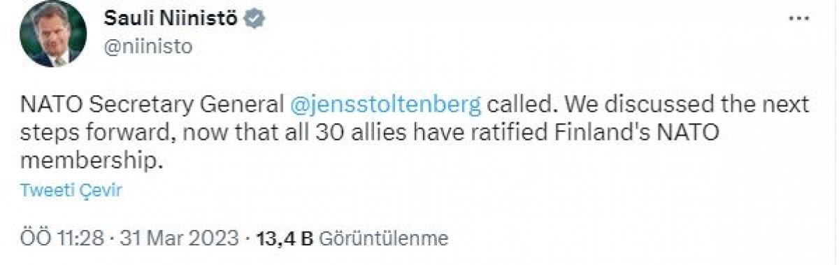 Finlandiya Cumhurbaşkanı Sauli Niinistö da sosyal medya hesabından Stoltenberg’le telefon görüşmesine dair yaptığı açıklamada, “NATO Genel Sekreteri Jens Stoltenberg aradı. 30 müttefikin tamamının Finlandiya’nın NATO üyeliğini onaylamasıyla birlikte atacağımız sonraki adımlar üzerine görüştük” dedi.