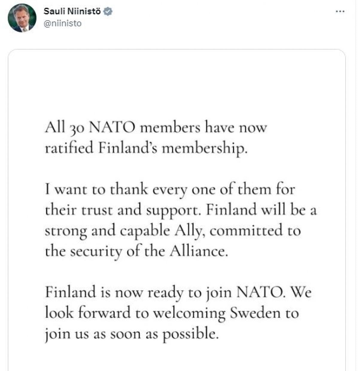 Niinistö ayrıca kanun teklifinin kabul edilmesinin hemen ardından yaptığı yazılı açıklamada, “30 NATO üyesinin tamamı şimdi Finlandiya'nın üyeliğini onayladı. Her birine bize olan güvenleri ve destekleri için teşekkür etmek istiyorum. Finlandiya, ittifakın güvenliğine bağlı, güçlü ve yetenekli bir müttefik olacaktır. Finlandiya artık NATO'ya katılmaya hazır. İsveç'i de en kısa zamanda aramızda görmeyi dört gözle bekliyoruz” ifadelerini kullanmıştı.