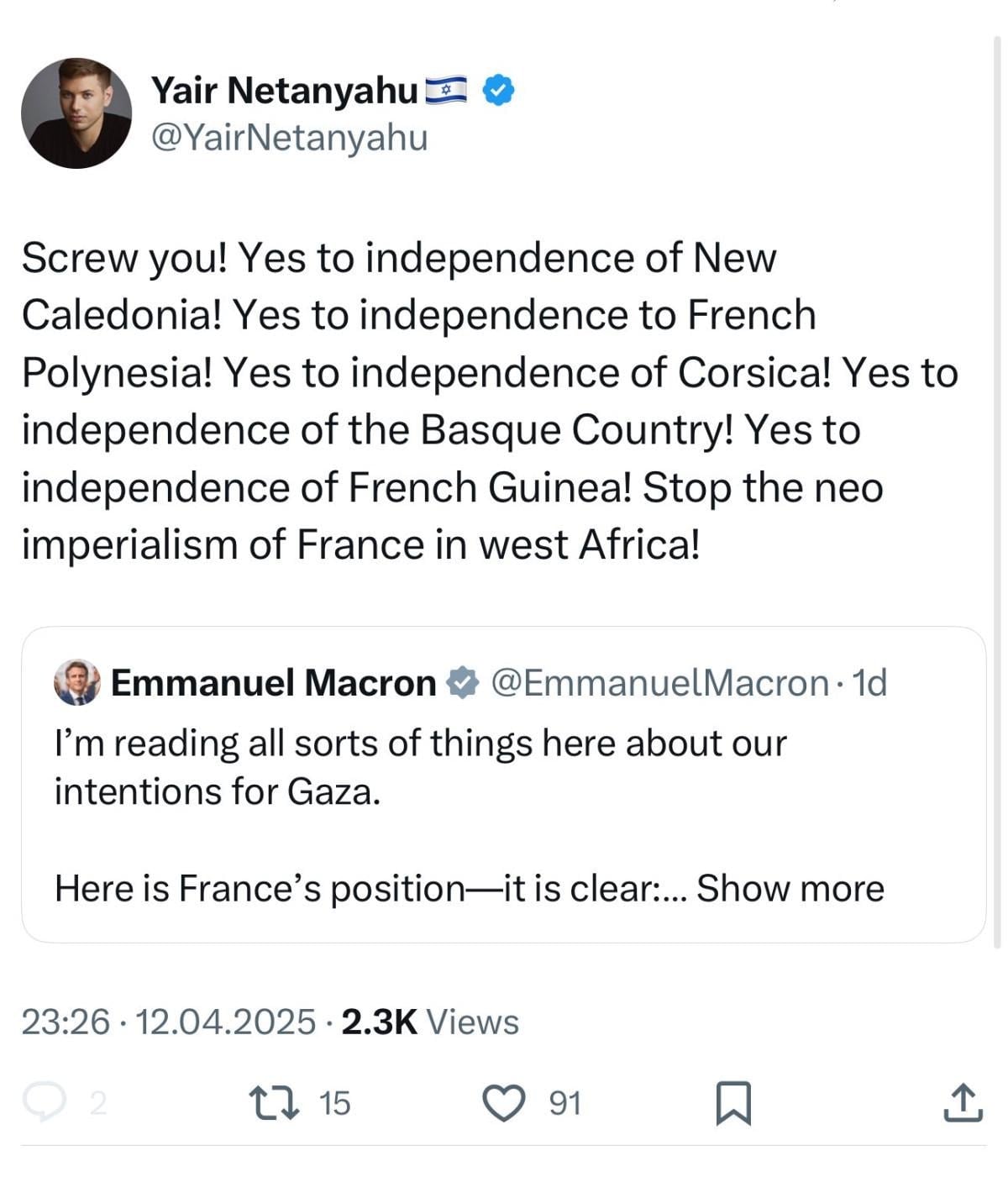 Yair, Fransa Cumhurbaşkanına hakaret ettiği paylaşımında, "Yeni Kaledonya'nın bağımsızlığına evet! Fransız Polinezyası'nın bağımsızlığına evet! Korsika'nın bağımsızlığına evet! Bask Ülkesi'nin bağımsızlığına evet! Fransız Ginesi'nin bağımsızlığına evet!" ifadelerine de yer vermişti.