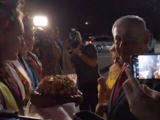 Bu karşılamada ikiliye, ‘karavay’ isimli geleneksel ekmek ikram edildi. Sara Netanyahu'nun ise ekmekten bir parça koparıp, yemeden yere attığı görüldü.