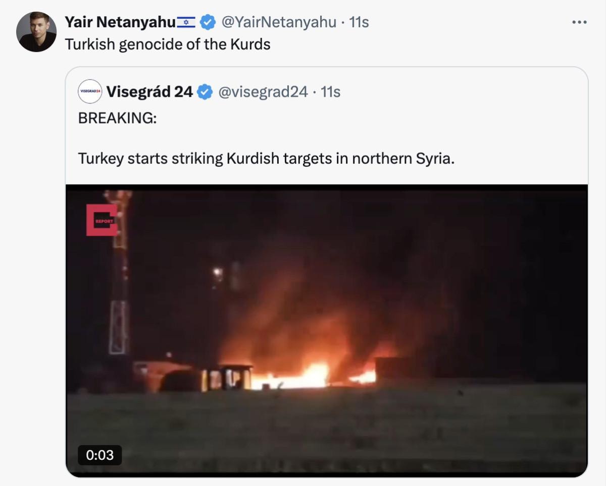 Yair Netanyahu, terör organlarına yakın bir sitenin "Türkiye, Kuzey Suriye'deki Kürt hedeflerini vuruyor." içerikli haberine şu yorumu yaptı: