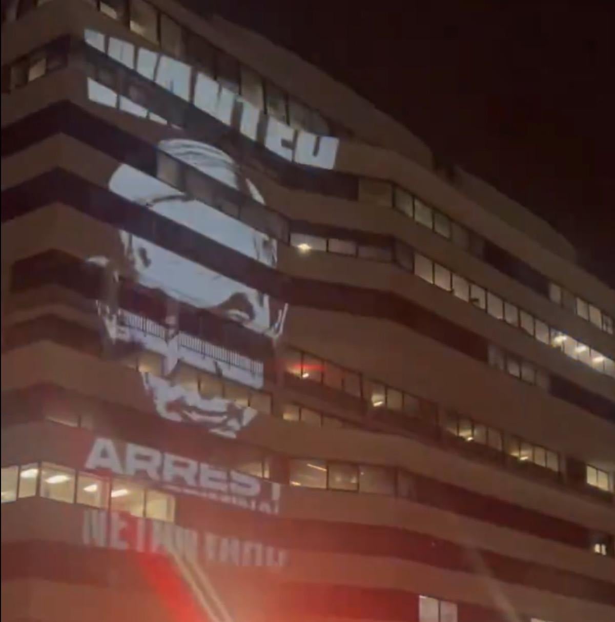 Protesto sırasında Netanyahu'nun kaldığı otel odasının dış cephesine, lazerle "Aranıyor. Savaş suçlusu Netanyahu'yu tutuklayın" yazıları yansıtıldı.