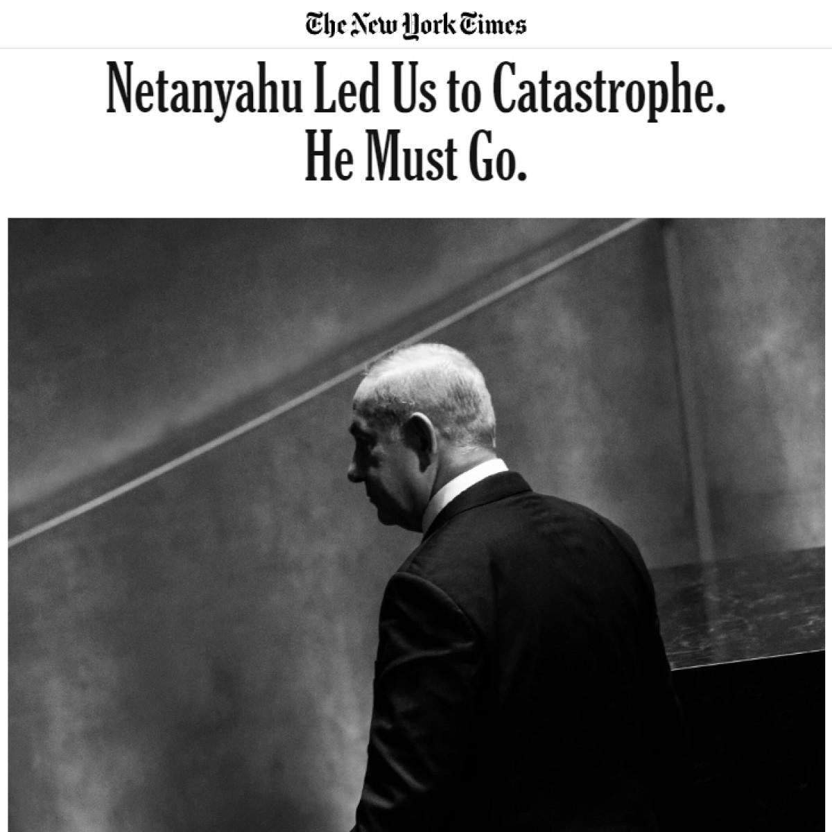 New York Times gazetesinde yayınlanan bir görüş yazısında, Netanyahu'nun İsrail'i felakete sürüklediği ve gitmesi gerektiği belirtildi.