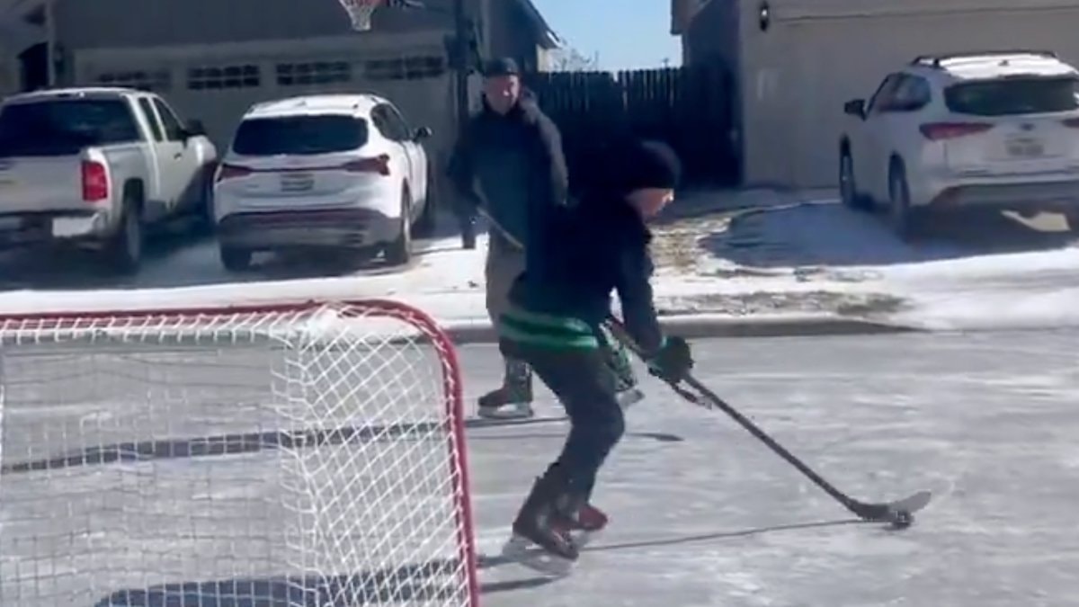 BABA VE OĞLU SOKAKTA BUZ HOKEYİ OYNADI