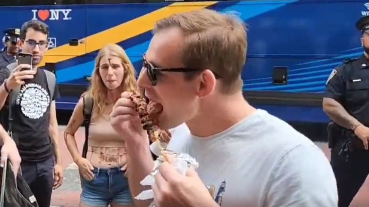 Elinde kebapla gruba yakalaşan bir Amerikalı ise dikkat çeken hareketlere imza attı ve aktivistlerin karşısına geçip kebap yedi.