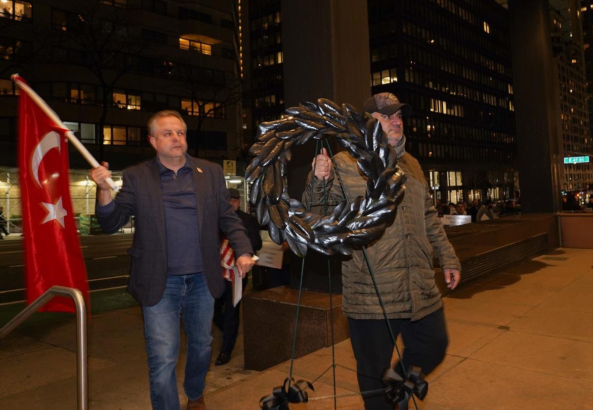 Türkevi'den New York'taki İsveç Başkonsolosluğu'na yürüyen protestocular, burada basın bildirisi okuduktan sonra İsveç Başkonsolosluğu girişine siyah çelenk bıraktı.