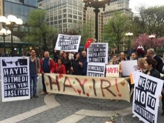 Laik ve Demokratik Türkiye Platformu tarafından New York’ta Union Meydanı’nda bir araya gelen protestocular ellerinde, "Hayır bitmedi, daha yeni başlıyor", "Yolsuzluk bulaştırılan referandumu kabul etmiyoruz", "2.5 milyondan fazla oy manipüle edildi", "Biz diktatörlüğe 'hayır' diyoruz" yazılı dövizler taşıdı.