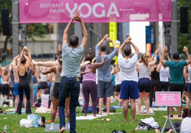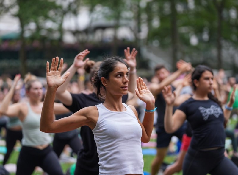 New York'un Manhattan bölgesinde bulunan Bryant Park'ta bir araya gelen birçok kişi, düzenlenen yoga etkinliğine katıldı.