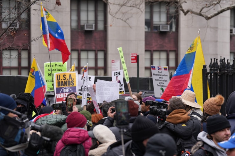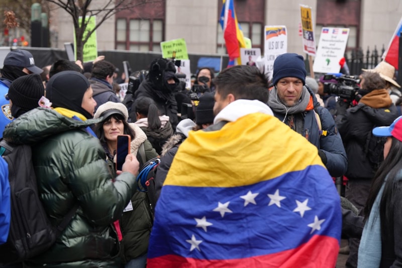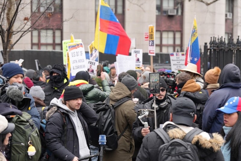 New York'un Manhattan bölgesinde bulunan Güney Bölge Federal Mahkemesi önünde aralarında Venezuelalıların da bulunduğu bir grup protestocu, Maduro ve eşinin serbest bırakılması talebiyle protesto düzenledi.