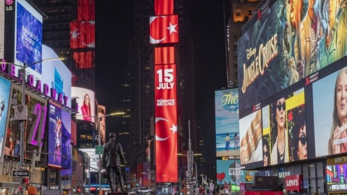 New York’un dünyaca bilinen Times Meydanı’nda bulunan dev dijital ekranda 15 Temmuz, "Victory of Democracy" (Demokrasi Zaferi) ve "Türkiye Geçilmez" mesajıyla anlatıldı.