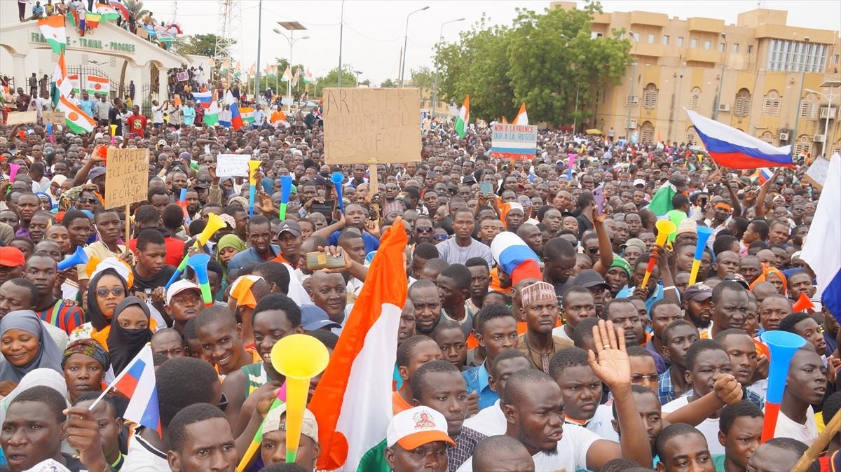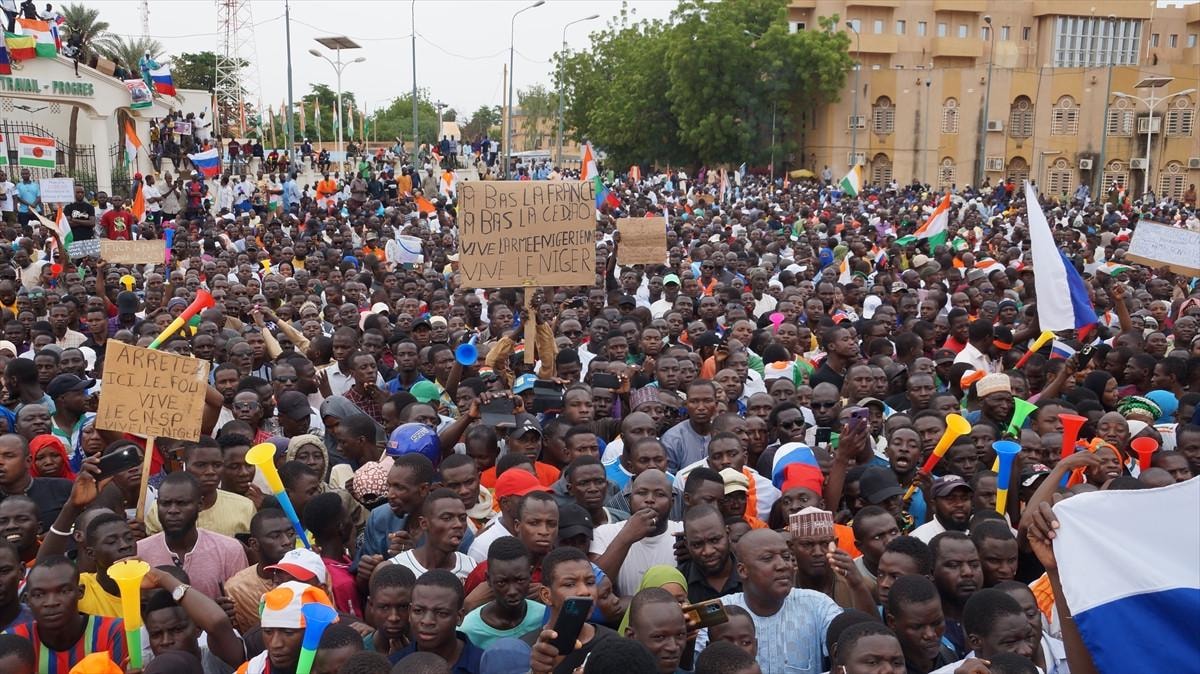 Niamey'de Ulusal Meclis önünde toplanan göstericiler, Batı Afrika Devletleri Ekonomik Topluluğunun (ECOWAS) olası askeri müdahalesine karşı çıkarak Vatanı Koruma Ulusal Konseyi (CNSP) isimli askeri yönetime desteğini yineledi.