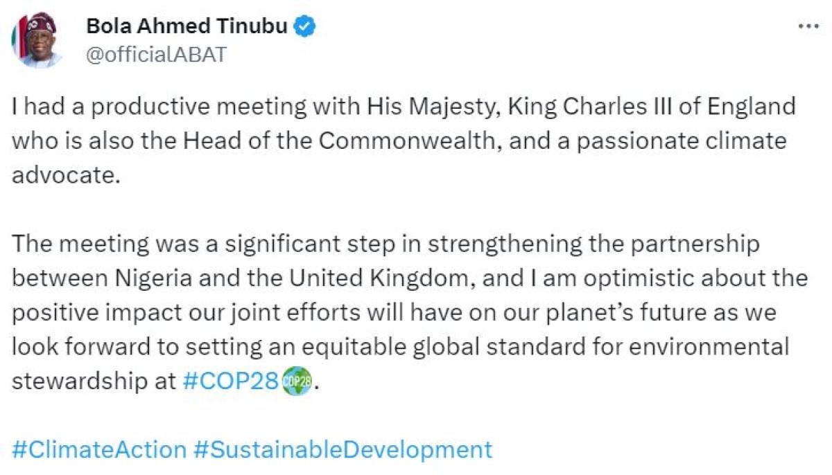 Görüşmeye ilişkin X sosyal medya hesabından paylaşım yapan Tinubu, Kral Charles ile verimli bir toplantı yaptıklarını belirtti.
