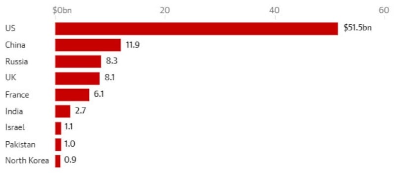 ABD 51.5 milyar dolar ile ilk sırada yer aldı. Çin 11.9 milyar dolar harcarken, Rusya 8.3 milyar dolarlık harcamaya gitti.