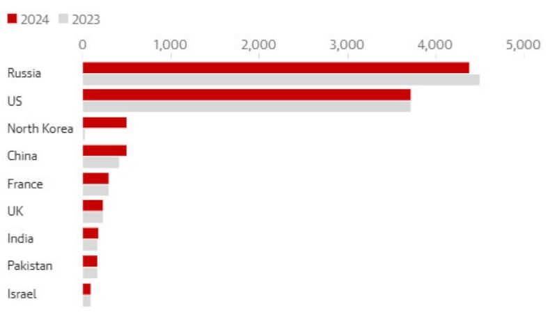 ABD'yi sırasıyla Kuzey Kore, Çin, Fransa, İngiltere, Hindistan, Pakistan ve İsrail takip ediyor.