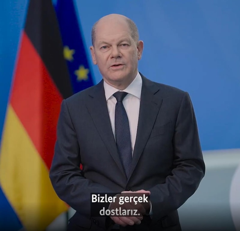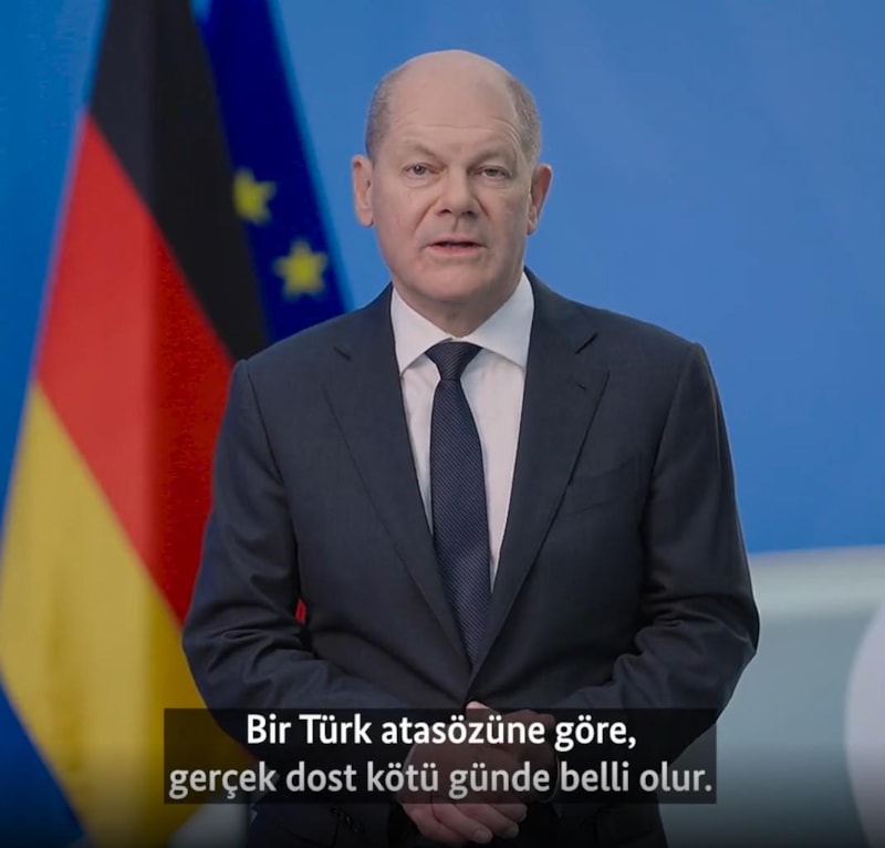 Başbakan Scholz, Türk atasözü “Gerçek dost kötü günde belli olur“ ifadesini Türkçe dile getirdi. Almancada da bunu “İnsan gerçek dostunu sıkıntıda tanır” şeklinde benzer bir şekilde söylediklerine işaret eden Scholz, şöyle dedi: