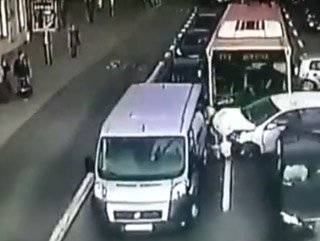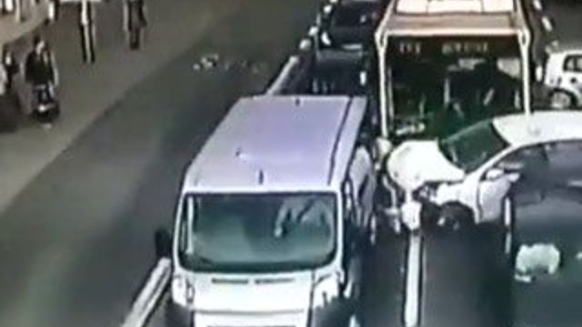 Araçlardan bazılarını kullanılamaz hale getiren otobüs görüntüden çıkıncaya kadar ilerliyor.