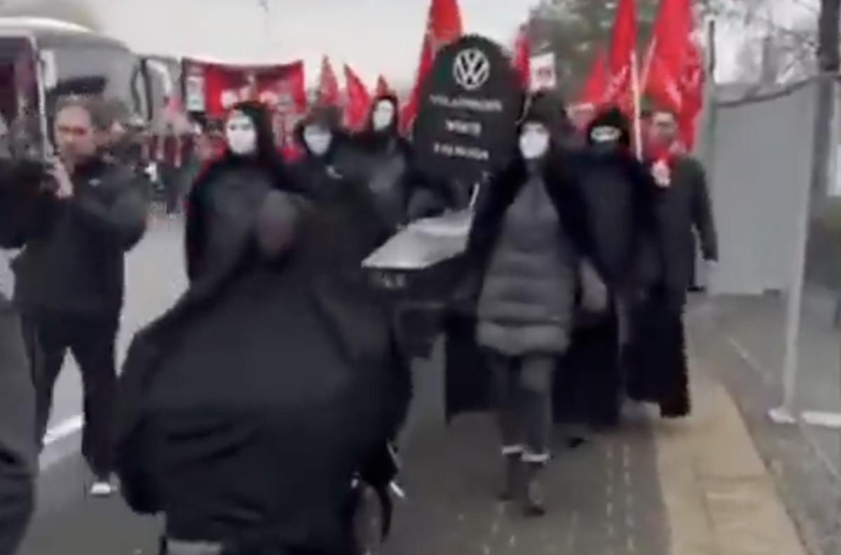 Ayrıca işçiler ellerinde tabut ve giydikleri siyah elbiselerle birlikte Volkswagen için cenaze töreni düzenlediler.