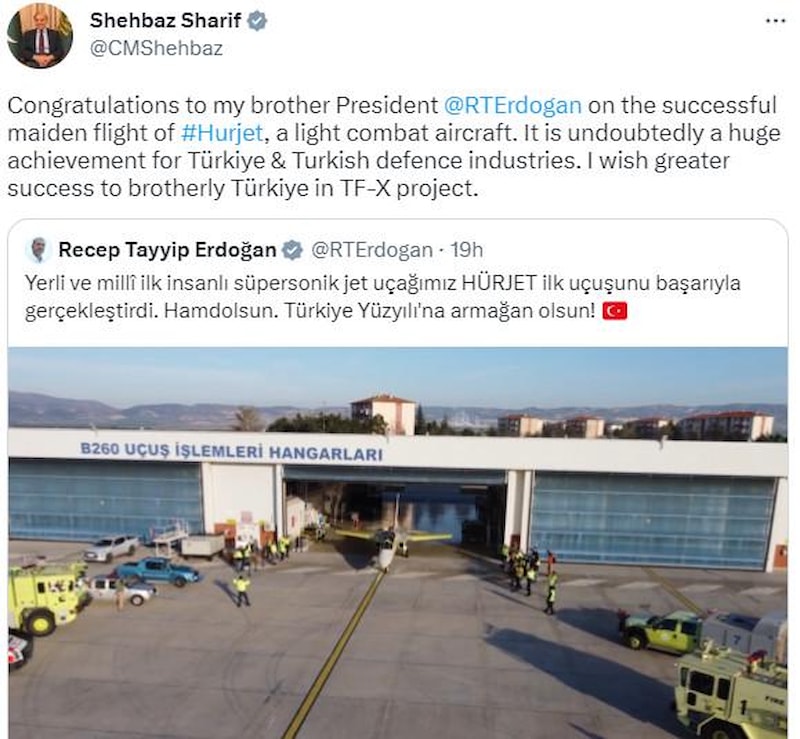 Erdoğan'ın paylaştığı görüntüyü alıntılayan Pakistan Başbakanı Şahbaz Şerif, tebrik mesajına yer verdi: