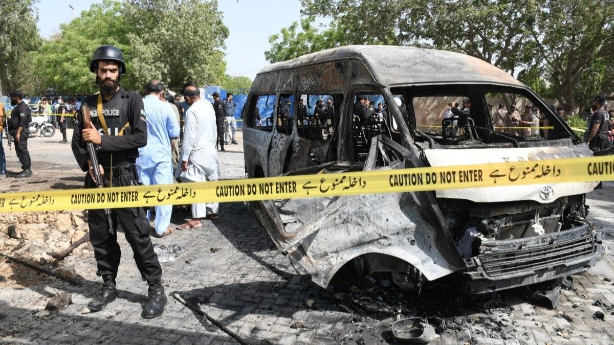 Karaçi Üniversitesi'nin eğitim kursu yakınlarında bulunan bir minibüs bilinmeyen nedenle infilak etti.