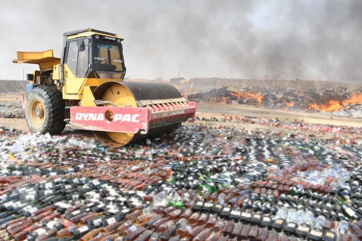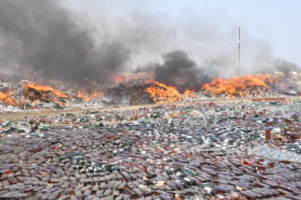 Uyuşturucular ekipler tarafından ateşe verilirken, alkol şişeleri iş makineleriyle ezildi.