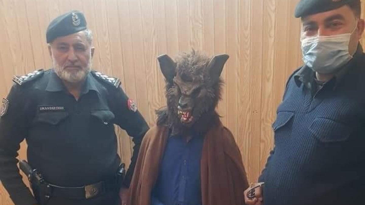 Pakistan'ın Peşaver şehrinde kurt maskesi giyen bir adam, çevredekileri korkuttuğu gerekçesiyle yakalandı.