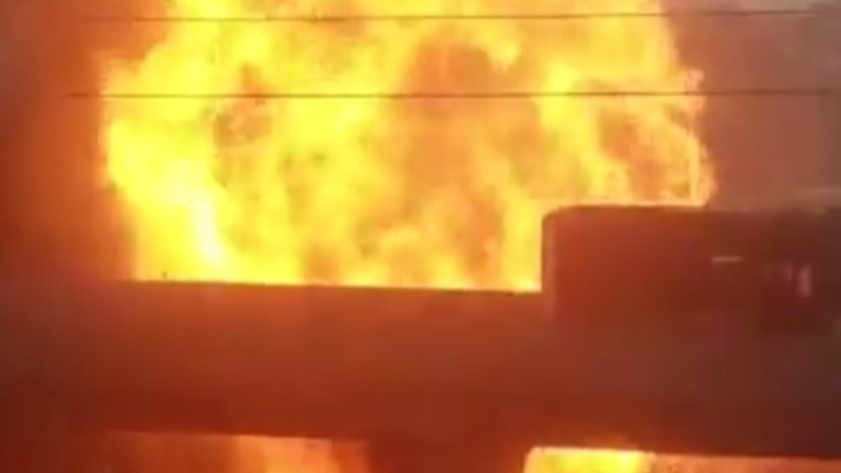 Alev alan tüp, çok sayıda kişinin ve otobüsün olduğu cadde üzerinde yuvarlandı.