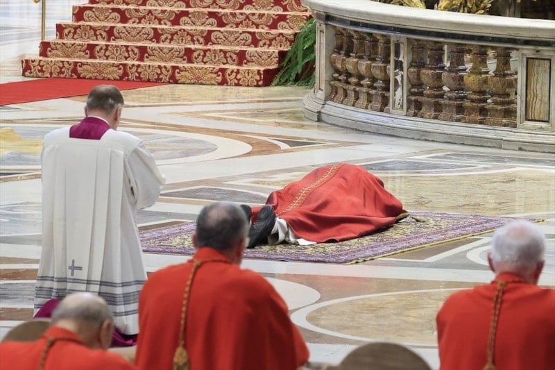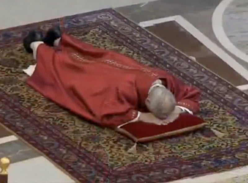 Ayinin başlangıcında Papa Leo, kırmızı tören giysileriyle tamamen yüzüstü yere uzanarak dua etti.
