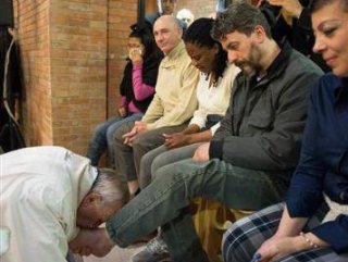 Paskalya'dan önceki "Kutsal Perşembe Töreni" için Roma'daki Rebbibia cezaevini ziyaret eden Papa Franciscus, 6'sı erkek, 6'sı kadın, yarısı İtalyan, yarısı farklı ülkelerden 12 tutuklunun ayaklarını yıkayıp öptü.