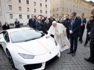 Papa Francesco'nun ikamet ettiği Vatikan'daki Santa Marta Konuk Evi önünde çarşamba sabahı yapılan törende, İtalyan lüks otomobil üreticisi Lamborghini'nin yöneticileri Papa'ya otomobili teslim etti. Papa Francesco, törende otomobili kutsadı ve kaputunu imzaladı.