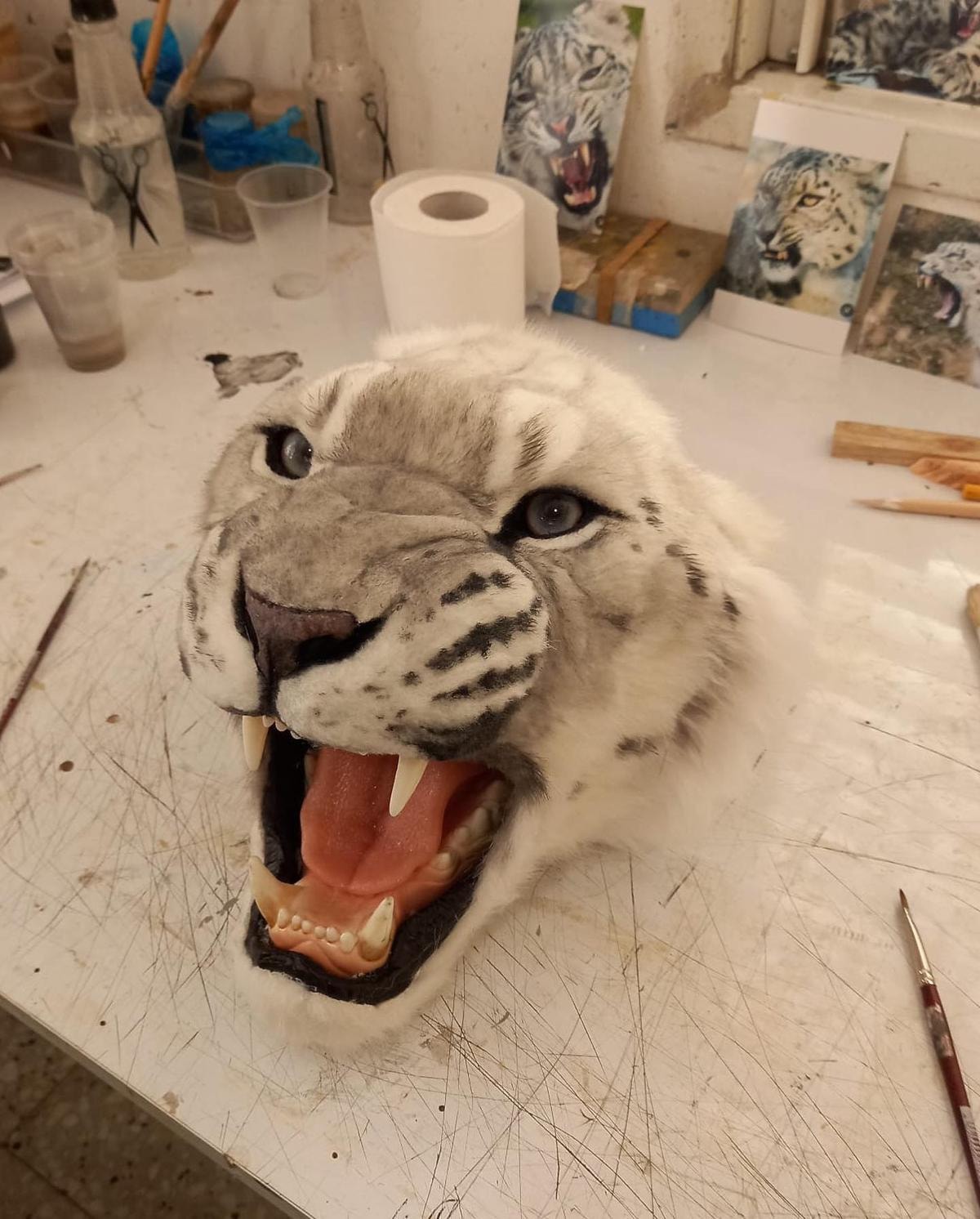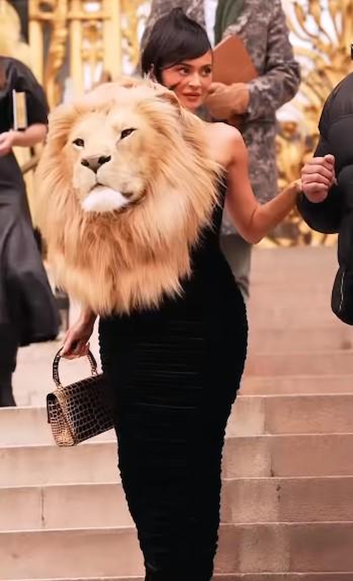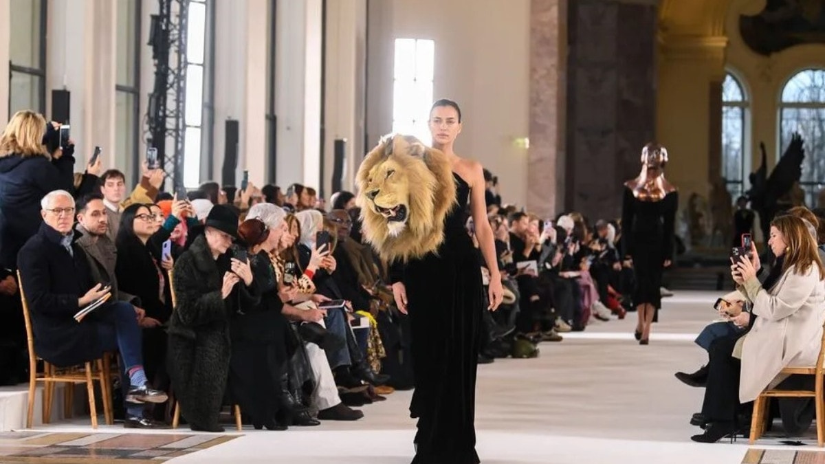 Paris'te dün yapılan defileye ilişkin yayınlanan görüntülerde, mankenlerden Shayk sağ omuzunda yapay aslan başıyla podyuma çıkarken, Campbell de sol omuzunda yapay kurt başıyla yürüyor.