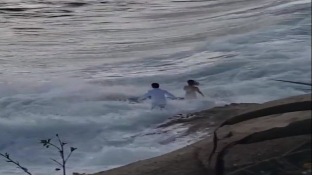 Çekim sırasında okyanus dalgalarının kayalara çarpmasıyla Pasifik Okyanus'una çekilen çift, az daha boğuluyordu.