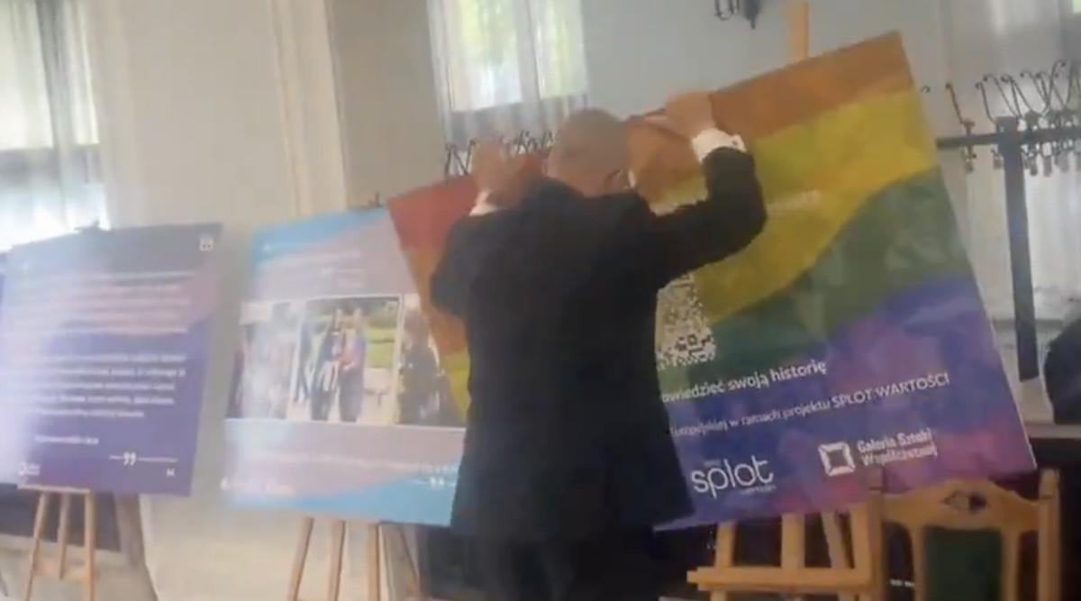 Avrupa Parlamentosu Milletvekili ve Polonya Tacı Konfederasyonu Partisi Genel Başkanı Grzegorz Braun, "Kamusal rezaleti engelliyorum." diyerek tabloları kaldırdı.