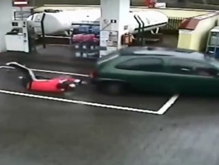 Polonya’da otomobiline gaz almak için istasyona yaklaşan bir kadın, ortalığı birbirine kattı. Araca gaz doldurulduğu esnada hareket etmeye çalışan sürücü, sesini duymadığı görevliyi yerde sürükledi.