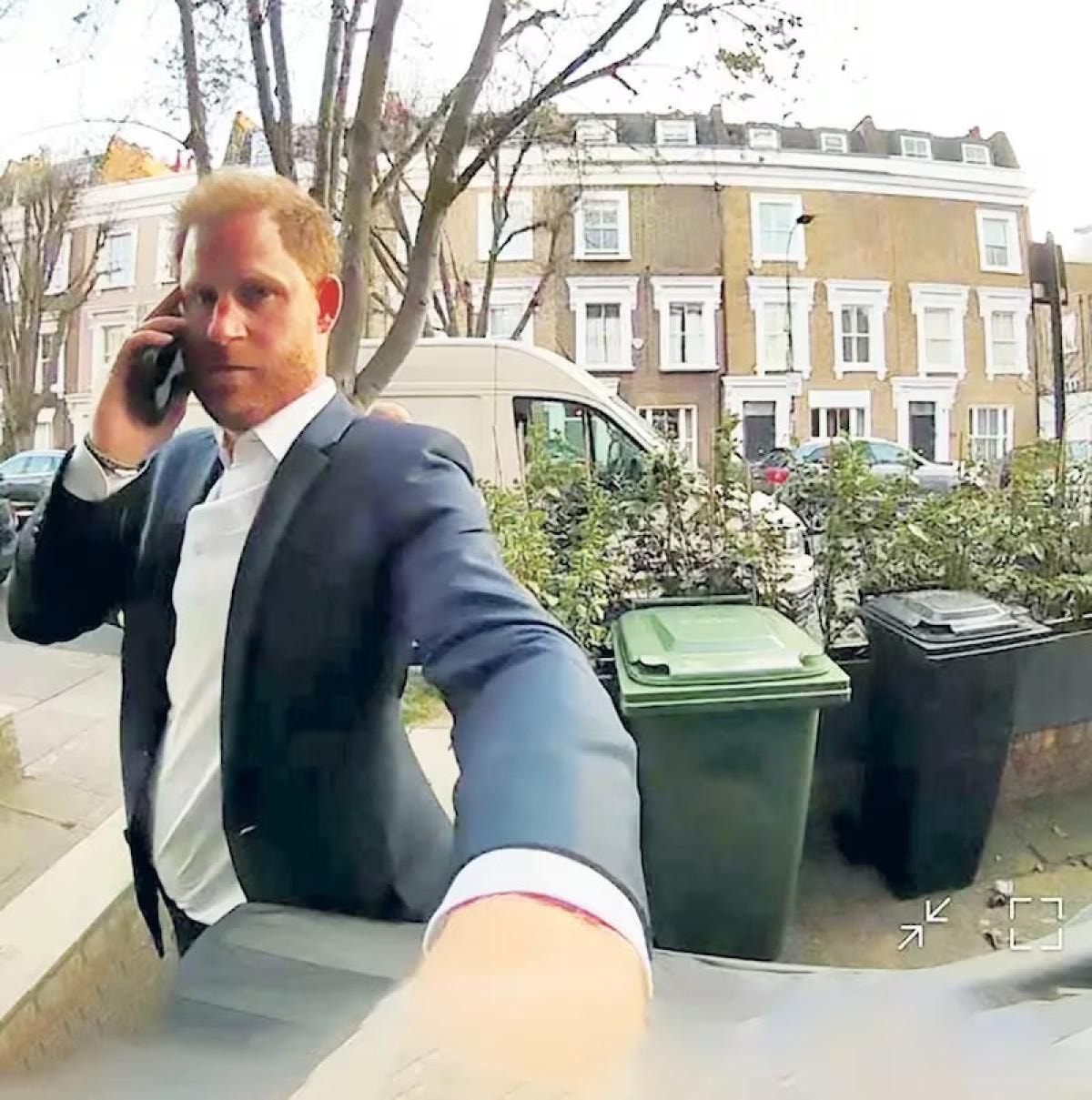 Görüntülerde Harry’nin mavi takım elbisesiyle ve telefonla konuşurken bina girişinde beklediği görülüyor.