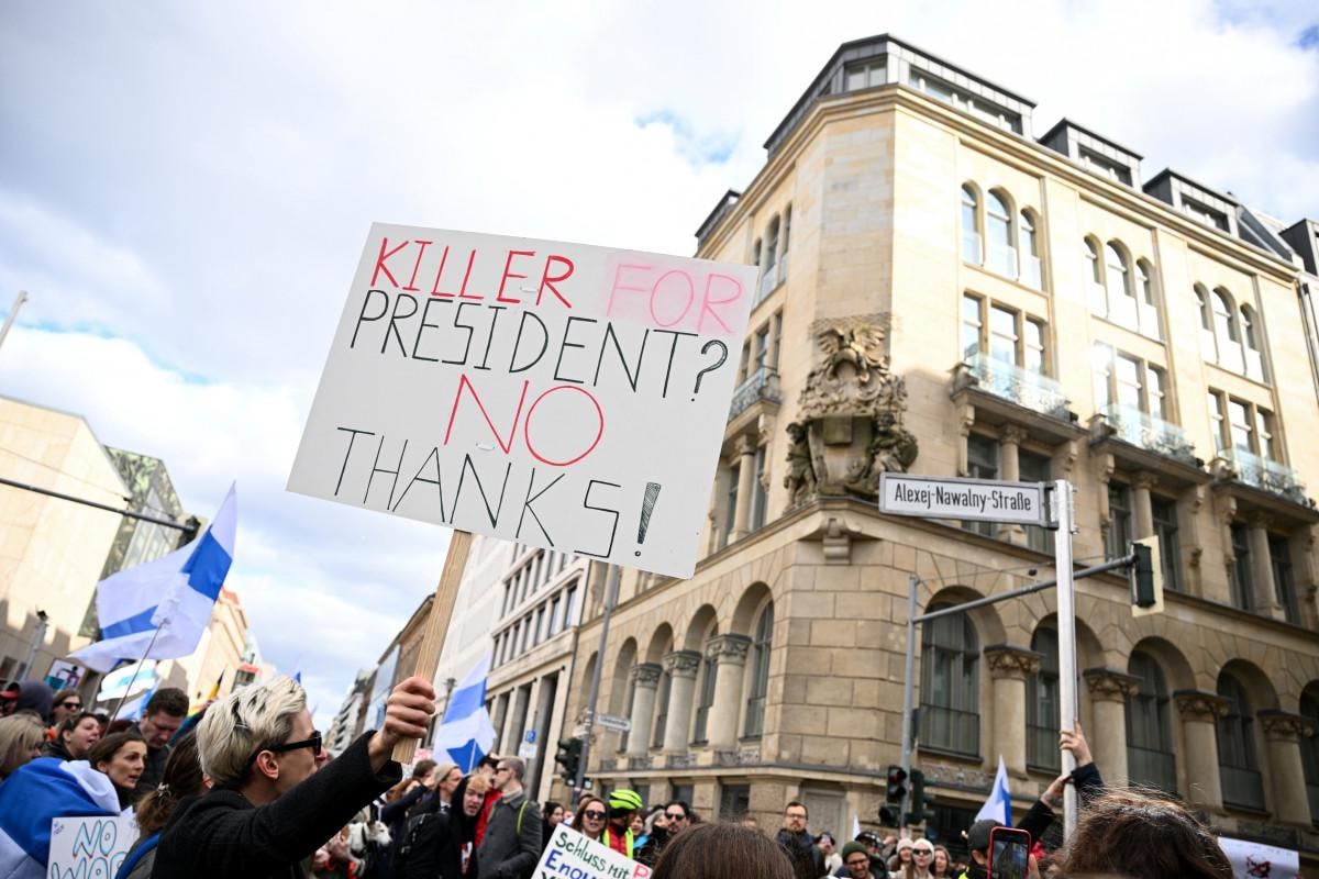 Ancak oy kullanmaya gelen bir grup eylemci, Rusya'daki devlet başkanlığı seçimi için oy kullanılan Rusya'nın Berlin Büyükelçiliği önünde toplandı.