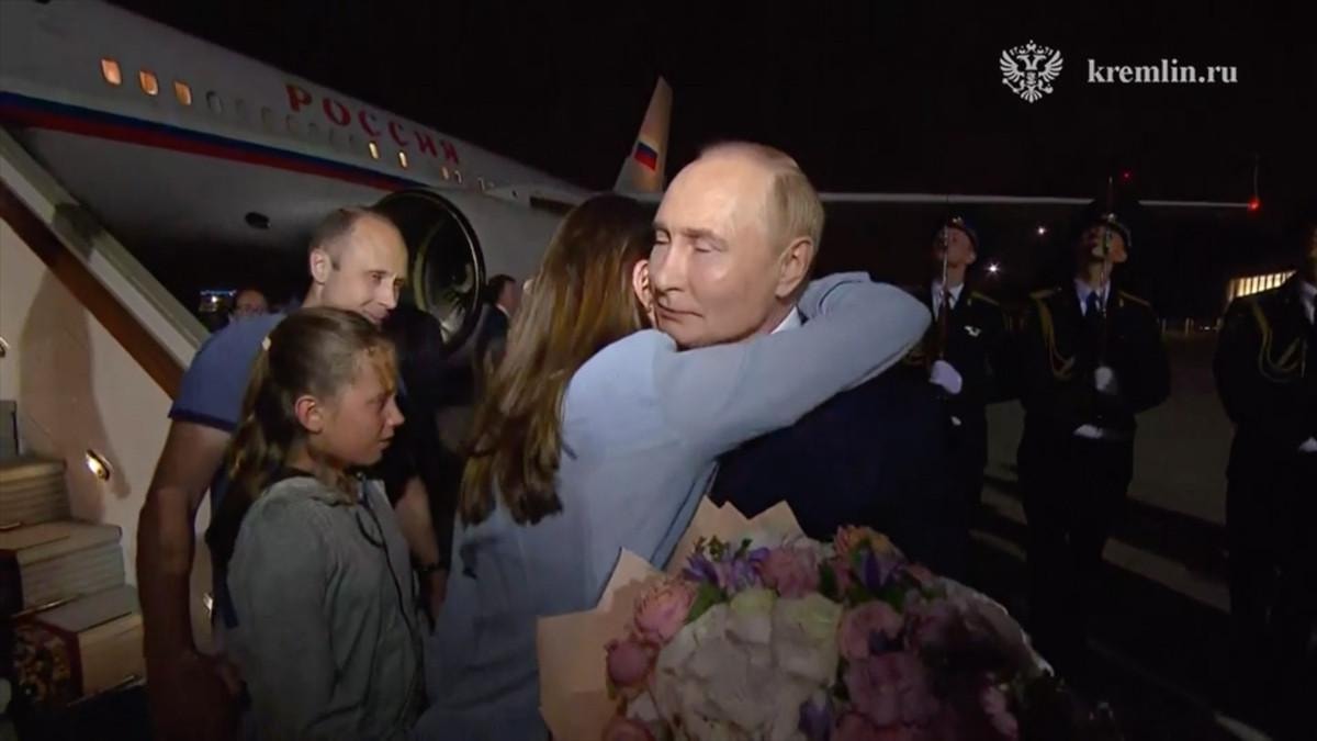 Uçaktan inenlerin tek tek elini sıkan Putin, ardından takas edilen kişilerle kırmızı halı üzerinde havalimanı binasına girerek burada bir konuşma yaptı.